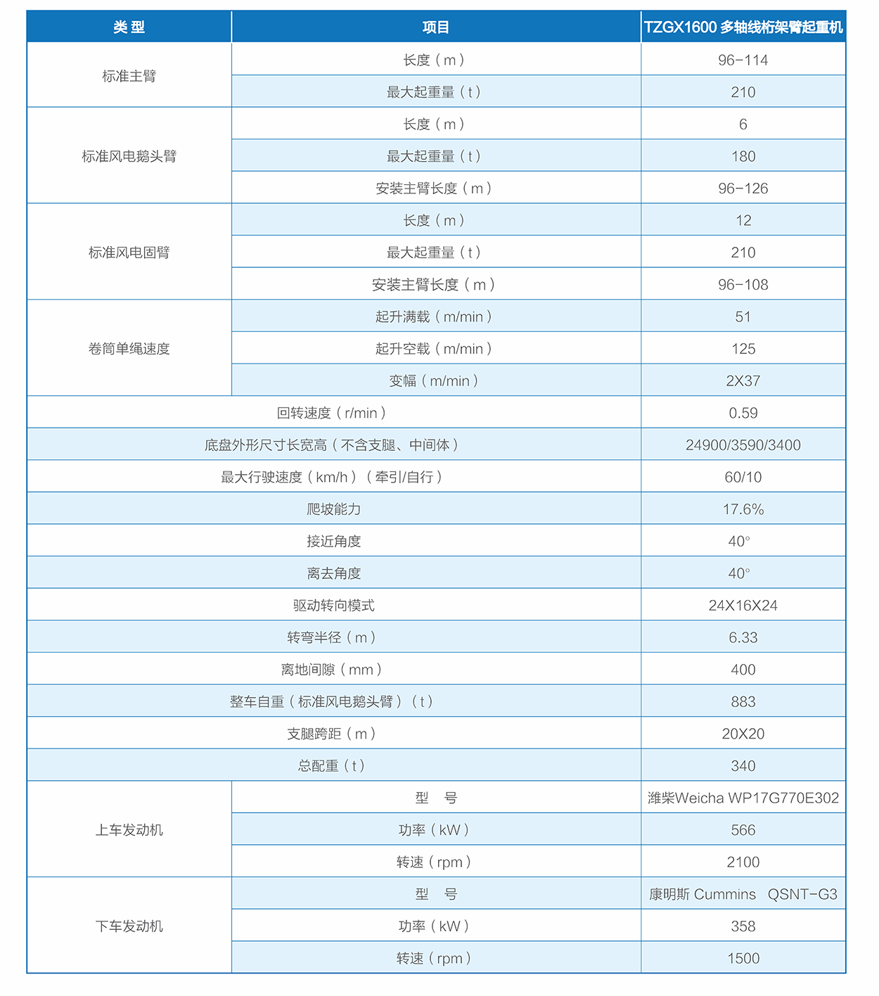TZGX1600多軸線桁架臂起重機(jī)針對風(fēng)機(jī)安裝特點(diǎn),上車采用快拆式桁架臂起重機(jī)結(jié)構(gòu),下車采用可自行、可牽引多軸線底盤,整機(jī)最大部件運(yùn)輸寬度小于3.5m,起重能力超強(qiáng),轉(zhuǎn)場高效便捷,可滿足百米級4.XMW及以上風(fēng)機(jī)吊裝。