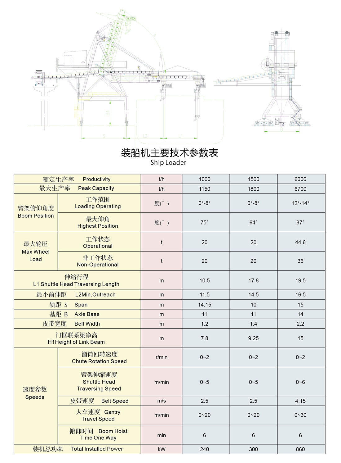 裝船機(jī),用于散貨專業(yè)碼頭,依據(jù)用戶散貨裝卸船作業(yè)設(shè)計(jì),以實(shí)現(xiàn)高效裝卸的起重機(jī)