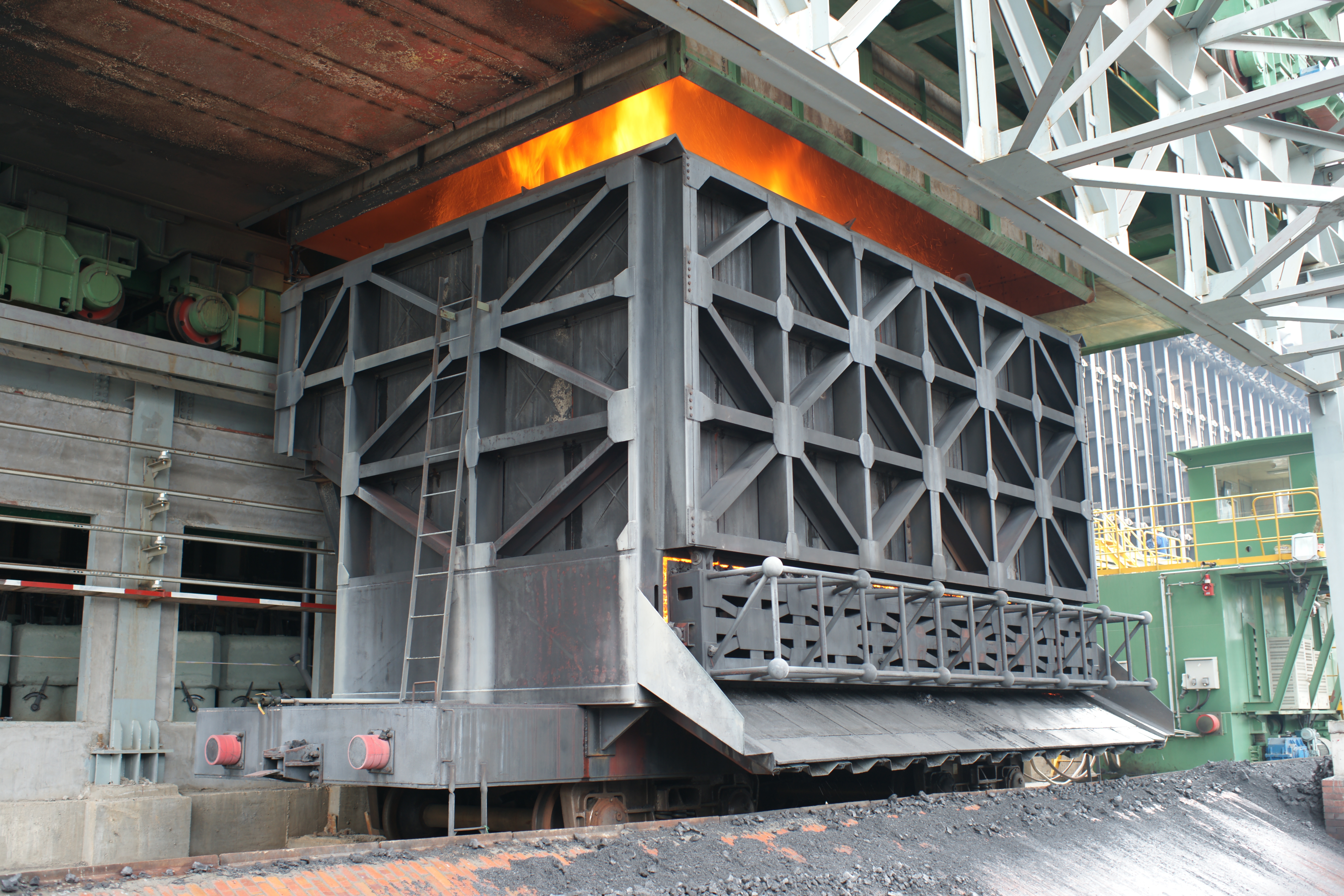 頂裝型焦爐機械設(shè)備包含頂裝煉焦流程的全套機械設(shè)備:裝煤車在煤塔下接收煤粉后運輸至炭化室進行煉焦;推焦車將焦炭由炭化室推送至熄焦車/焦罐車;攔焦車完成炭化室與熄焦車/焦罐車的連通;電機車是熄焦車/焦罐車的牽引設(shè)備,完成焦炭由煉焦爐區(qū)到熄焦塔/干熄焦區(qū)的轉(zhuǎn)運;熄焦車接收熾熱焦炭,并在煤塔下完成濕熄焦過程;焦罐車接收焦炭后輸送至干熄焦區(qū)域進行干熄焦工藝
