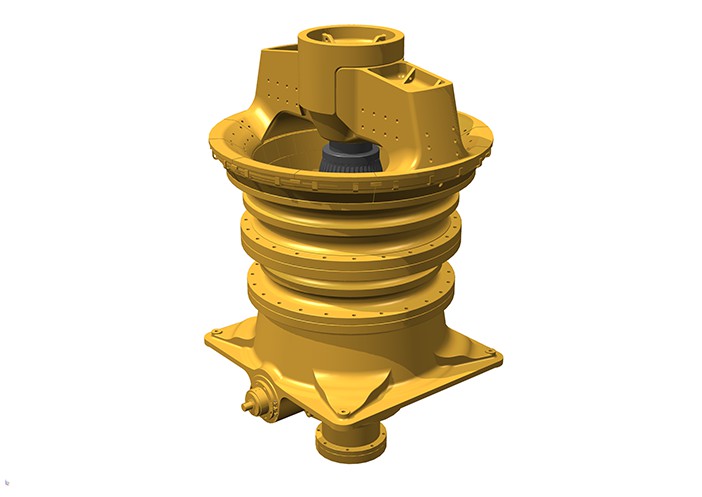 整體式主軸設(shè)計(jì)避免動(dòng)錐松動(dòng)的危險(xiǎn),減少停機(jī)維護(hù)時(shí)間,通過(guò)鎖緊螺母鎖緊固定動(dòng)錐襯板,方便動(dòng)錐襯板的更換。