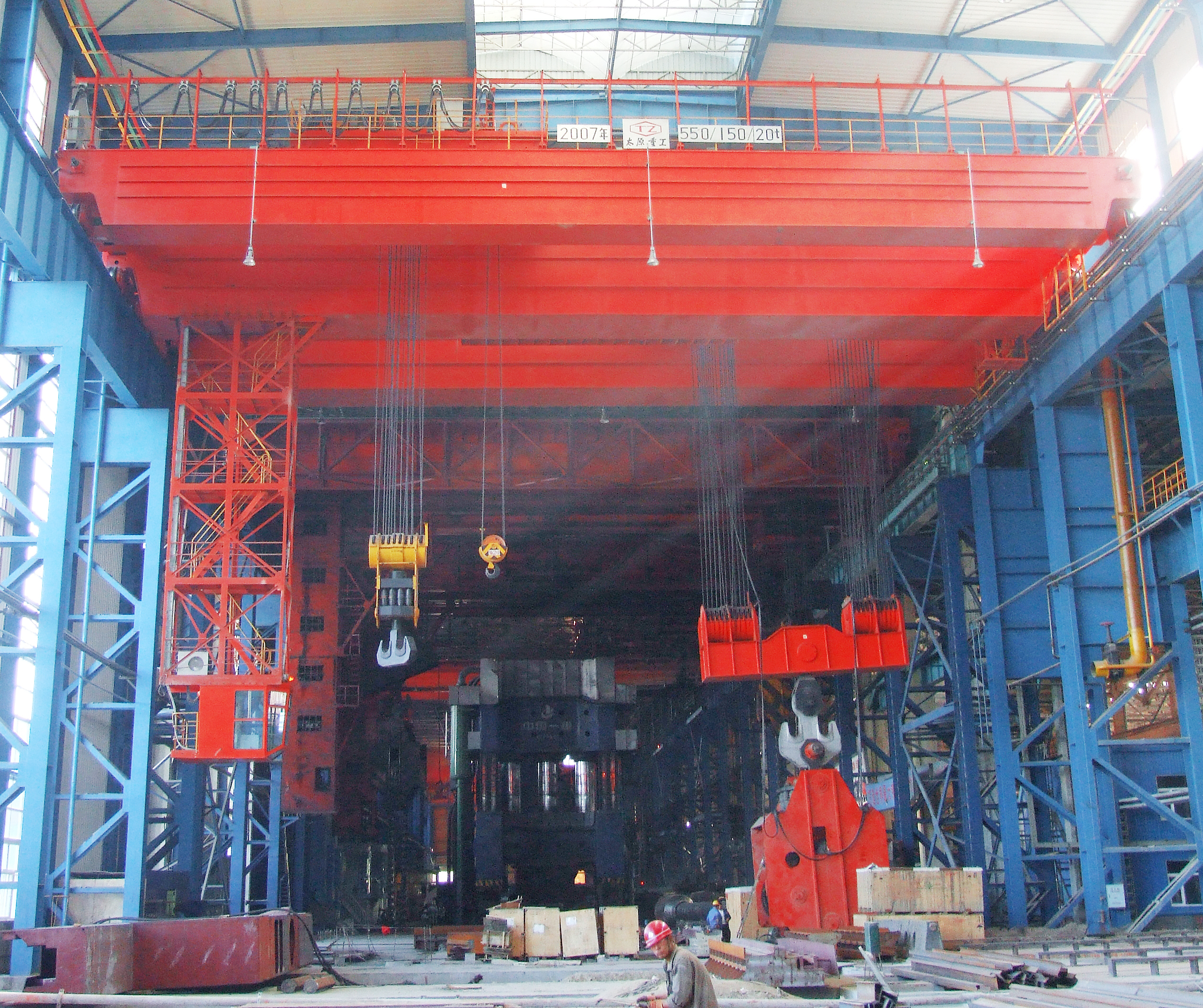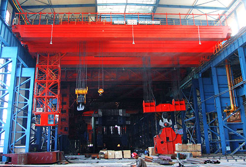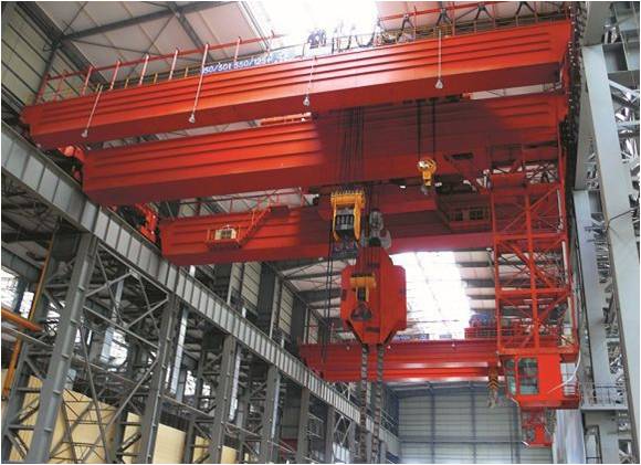 鍛造起重機(jī)工作時(shí),主、副鉤配合吊起工件,通過專用吊具(翻料機(jī))翻轉(zhuǎn)工件,工件被調(diào)整到適當(dāng)角度后放置于液壓機(jī)砧板上,液壓機(jī)開始工作。重復(fù)上述工作若干,直到工件被鍛造成合格品。由于鍛造過程中整機(jī)將受到較大的沖擊載荷,因此鍛造起重機(jī)設(shè)置有緩沖裝置及松閘裝置。此外鍛造起重機(jī)還擔(dān)負(fù)著廠房內(nèi)物料吊運(yùn)及設(shè)備安裝、維護(hù)等工作。
