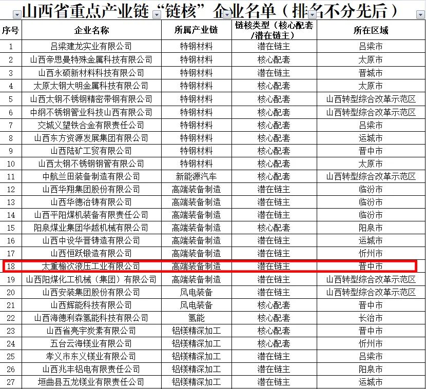 近日,山西省工業(yè)和信息化廳公示了山西省重點產業(yè)鏈“鏈核”企業(yè)名單,太重集團榆次液壓工業(yè)有限公司成功上榜高端裝備制造產業(yè)鏈潛在鏈主企業(yè),即高端裝備制造產業(yè)鏈“鏈核”企業(yè)。