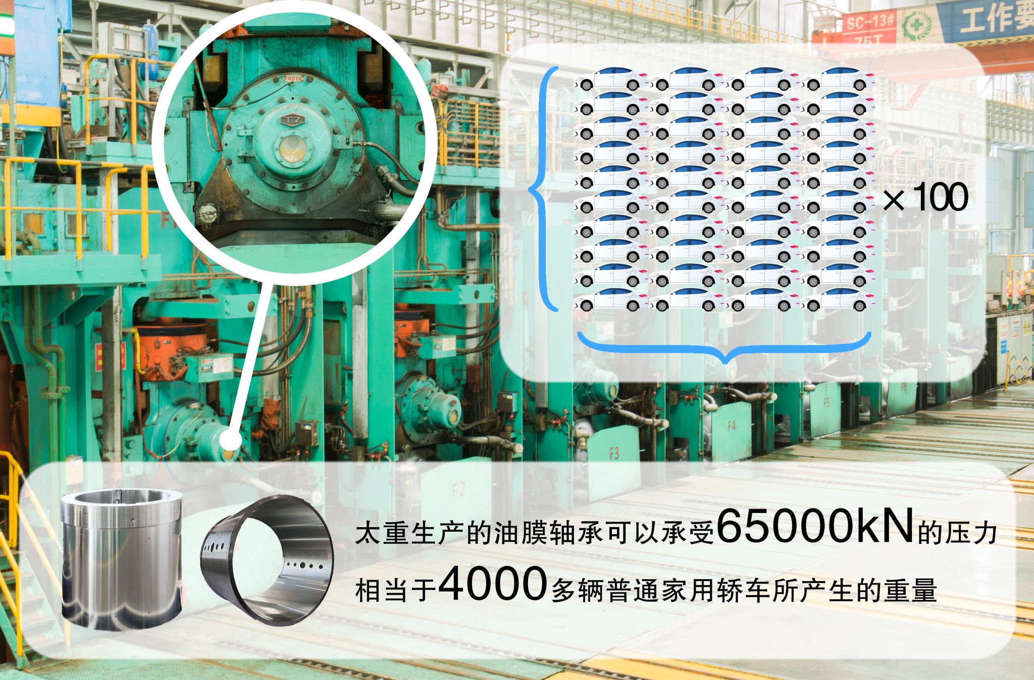 油膜軸承屬于全液體潤(rùn)滑軸承的范疇,相比其他液體滑動(dòng)軸承,其所處工況處于低速重載狀態(tài),作為現(xiàn)代軋機(jī)的心臟,太重生產(chǎn)的油膜軸承單個(gè)就可以承受65000kN(6700t)的壓力,相當(dāng)于4000多輛普通家用轎車所產(chǎn)生的重量。