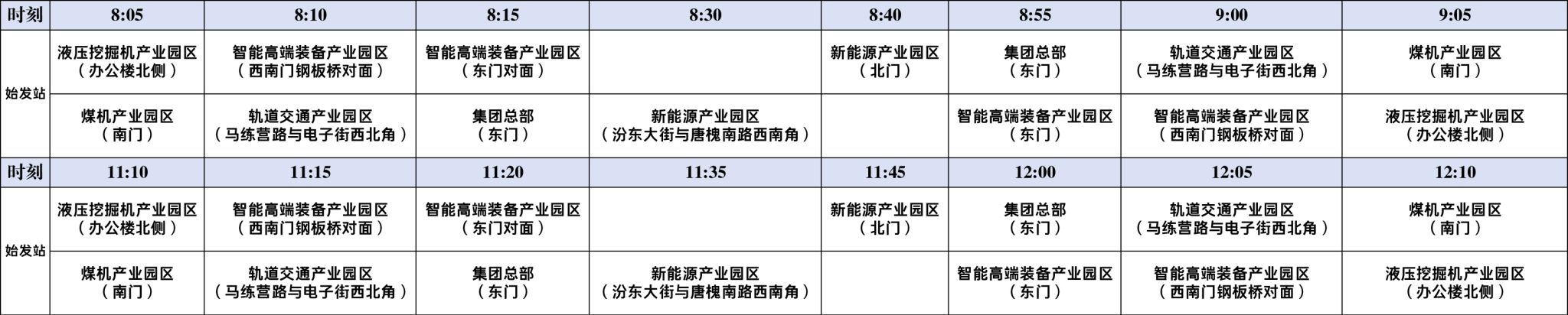 每日8:30、9:30、16:30、17:30,由太重智能高端裝備產(chǎn)業(yè)園區(qū)東門發(fā)車→尚賢路文源路口站(工程機(jī)械東二門)→南錄樹站(尚賢路口)→虎峪河千峰南路站→前進(jìn)路西礦街站(芙蓉外賣)→太重萬柏林園區(qū)玉河街前進(jìn)路站(醫(yī)院北門)。
