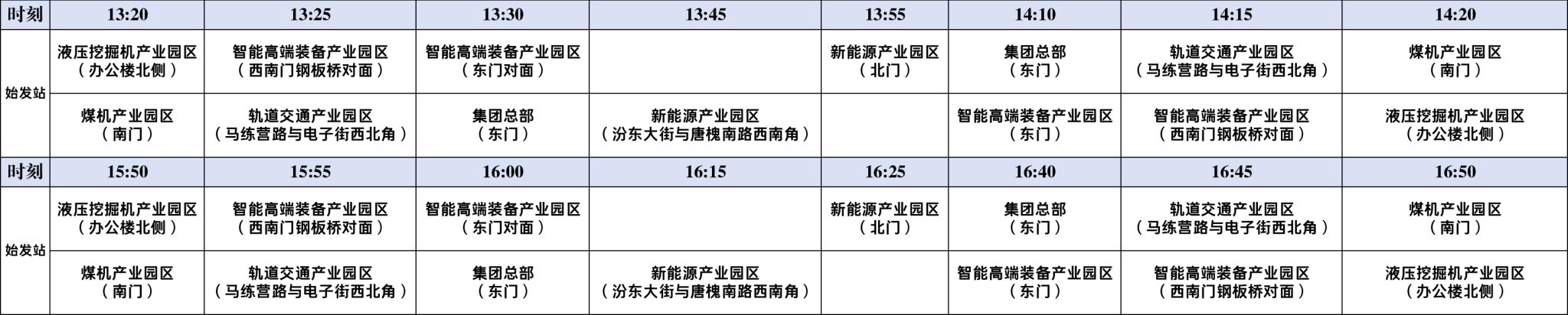 每日7:00、8:00、15:00、16:00,由太重萬柏林園區(qū)玉河街前進(jìn)路站(醫(yī)院北門)發(fā)車→前進(jìn)路西礦街站(芙蓉外賣)→虎峪河千峰南路站→南錄樹站(尚賢路口)→尚賢路文源路口站(工程機(jī)械東二門)→太重智能高端裝備產(chǎn)業(yè)園區(qū)東門。