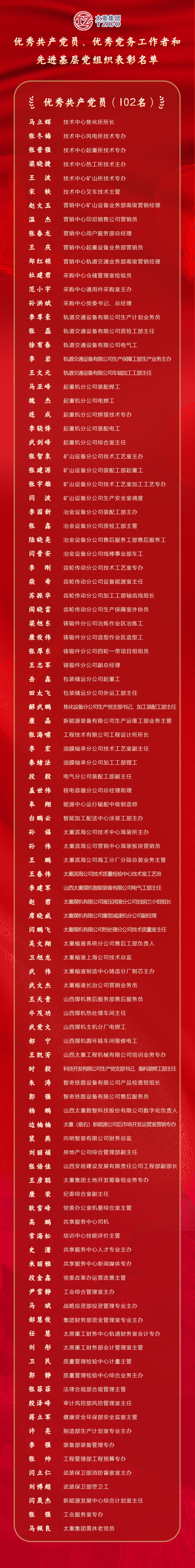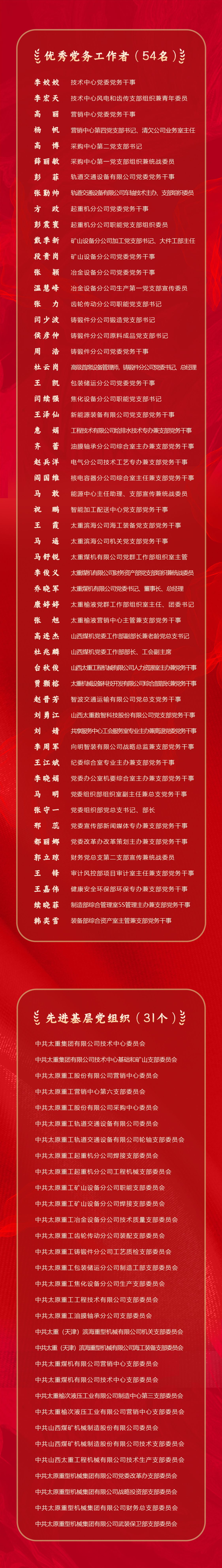 授予宋軼、鄭紅鎖等102名同志“優(yōu)秀共產(chǎn)黨員”稱號,授予張勤帥、高博、李宏天等54名同志“優(yōu)秀黨務(wù)工作者”稱號,授予中共太原重工油膜軸承分公司支部委員會、中共太原重型機(jī)械集團(tuán)有限公司財(cái)務(wù)總支部委員會、中共太重集團(tuán)有限公司技術(shù)中心委員會等31個(gè)黨組織“先進(jìn)基層黨組織”稱號。