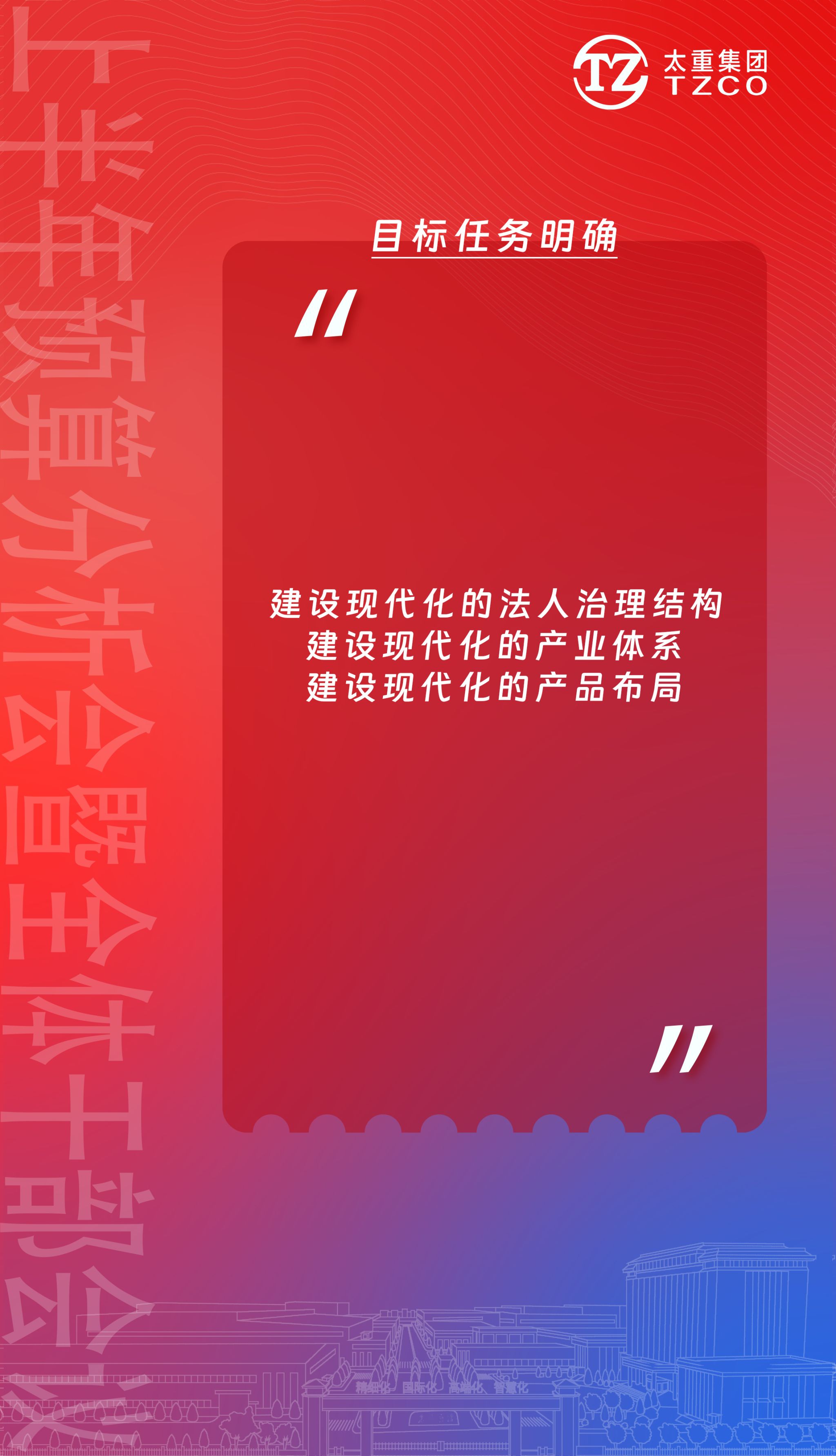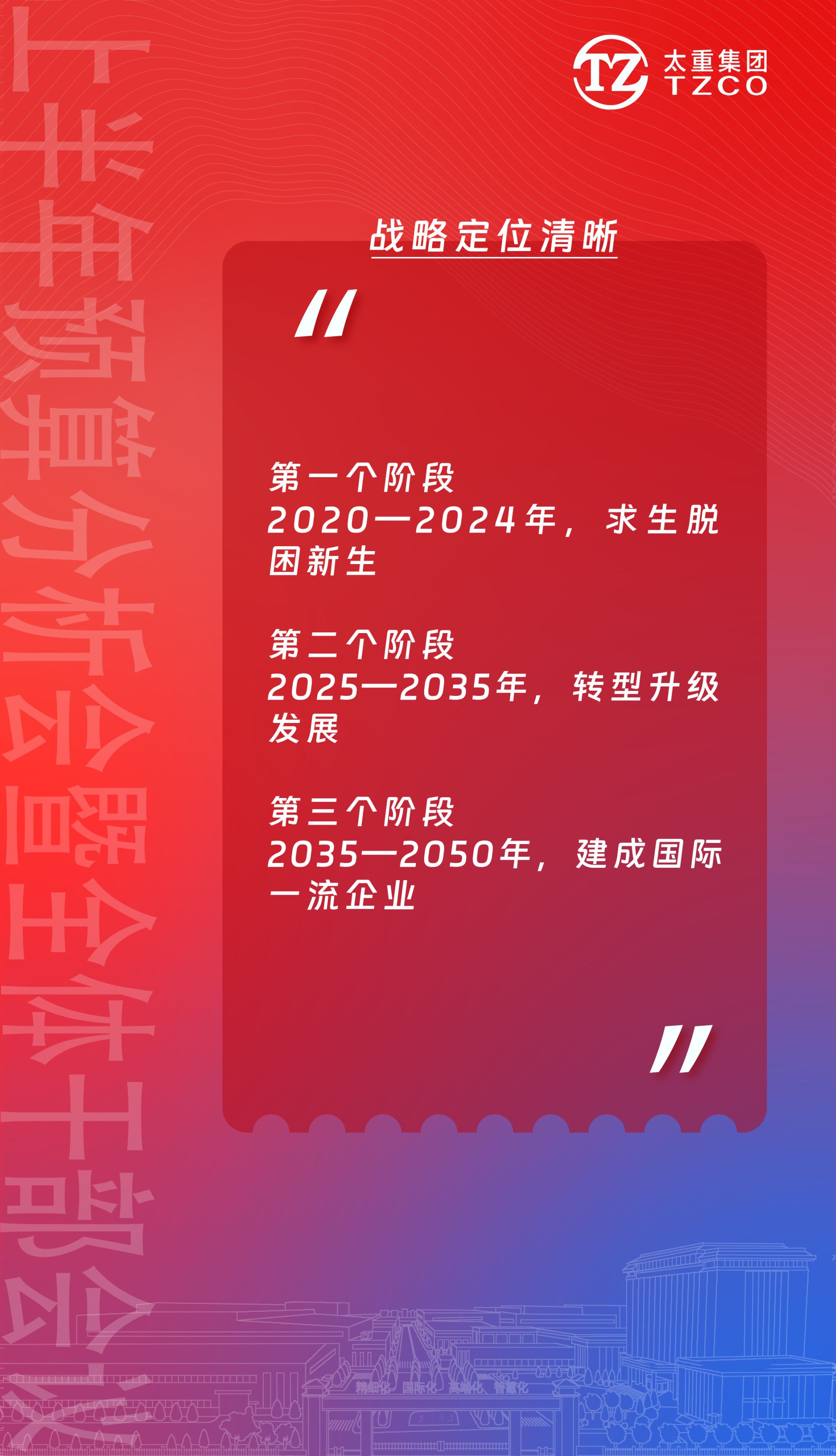 2024年7月18日,中國共產(chǎn)黨第二十屆中央委員會第三次全體會議通過《中共中央關(guān)于進(jìn)一步全面深化改革 推進(jìn)中國式現(xiàn)代化的決定》,提出“到二〇二九年中華人民共和國成立八十周年時,完成本決定提出的改革任務(wù)”。二〇三〇年,太重建廠八十周年,隨著國資國企改革的持續(xù)深化,太重必將完成轉(zhuǎn)型升級。