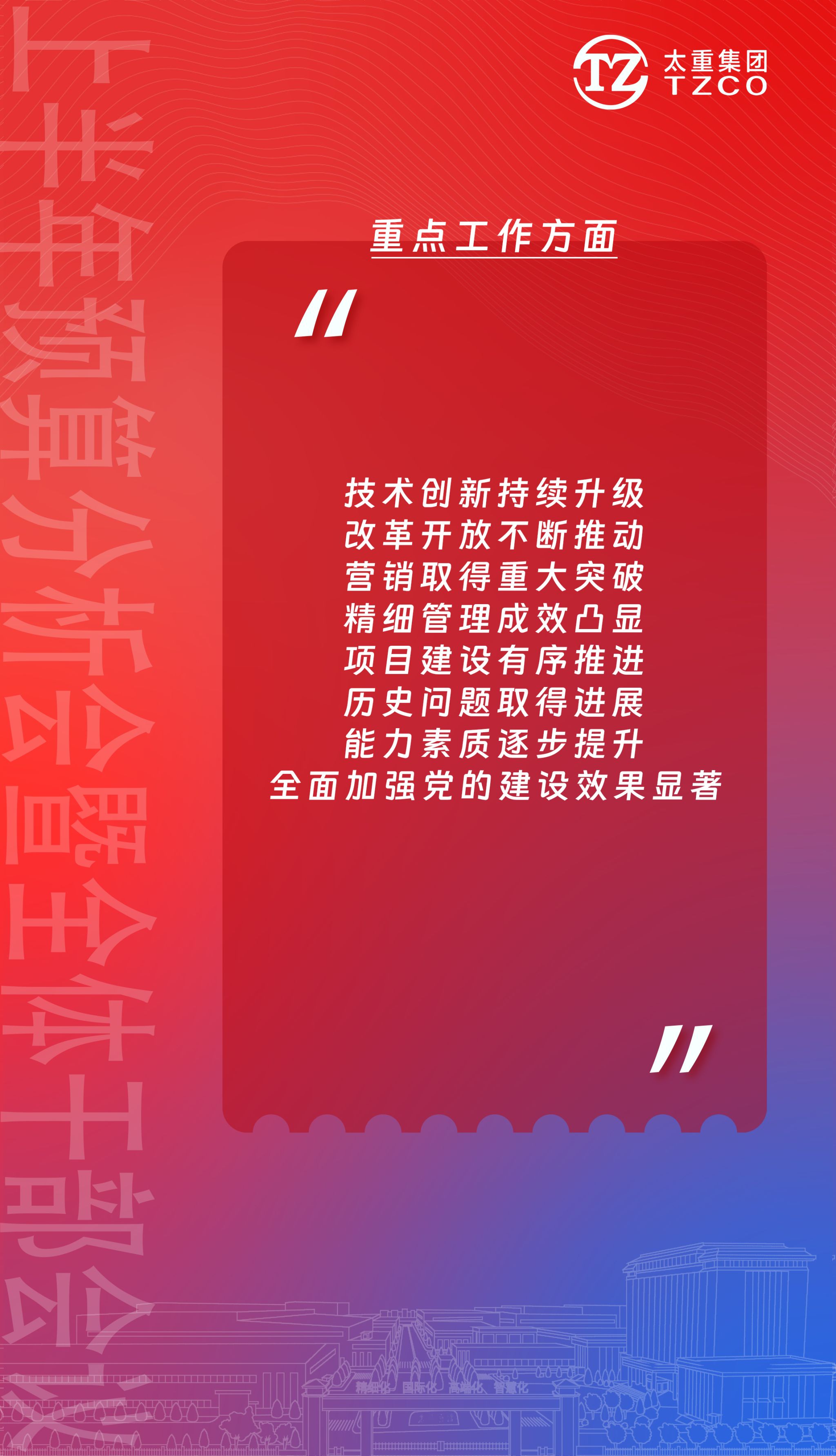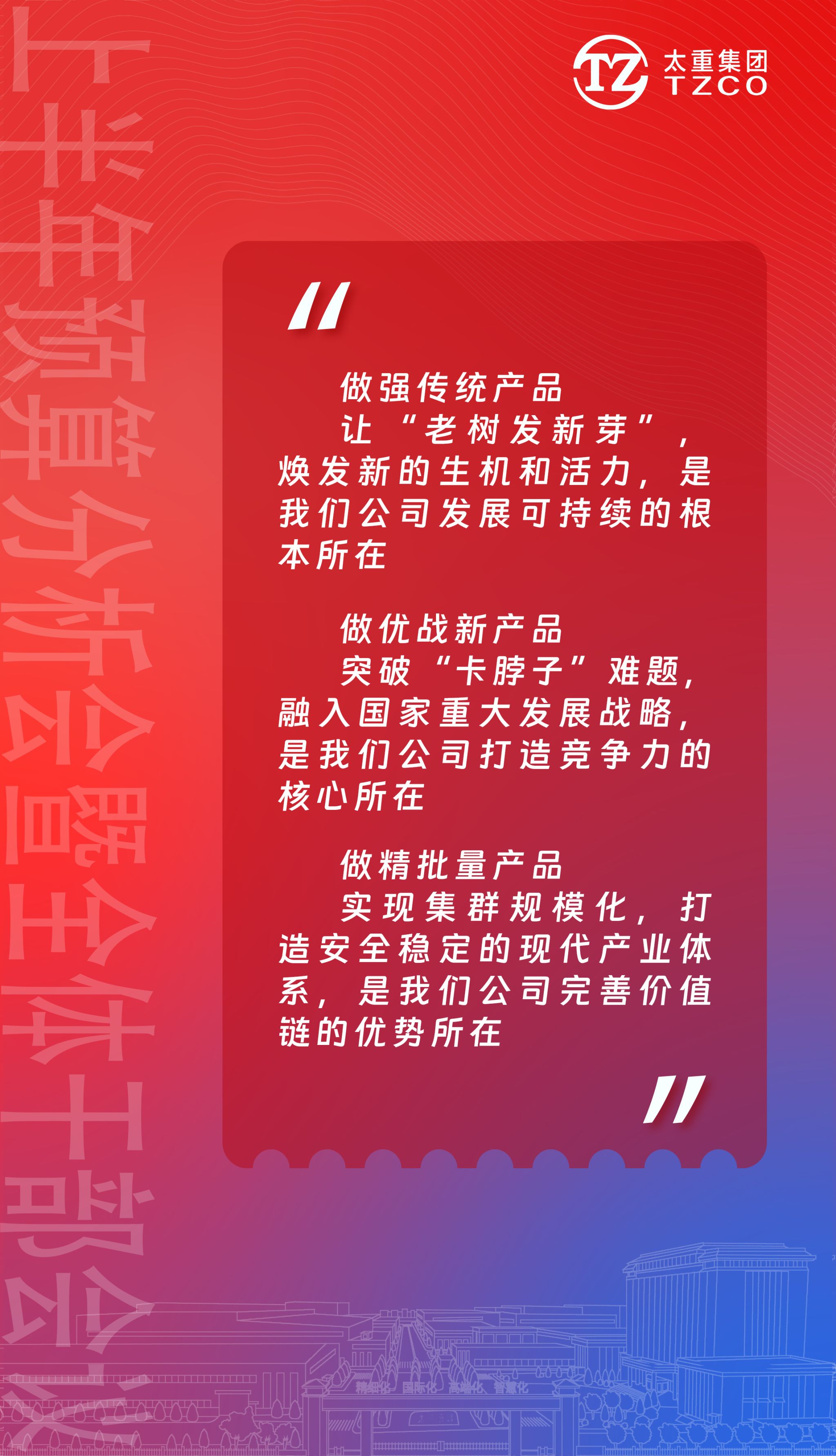 期待不容辜負(fù),使命不容懈??!讓我們上下同欲、團(tuán)結(jié)拼搏,鉚足干勁加油干,積勢蓄能攀新高,共同將太重建設(shè)成為跨越時空、基業(yè)長青、朝氣蓬勃的百年老店!