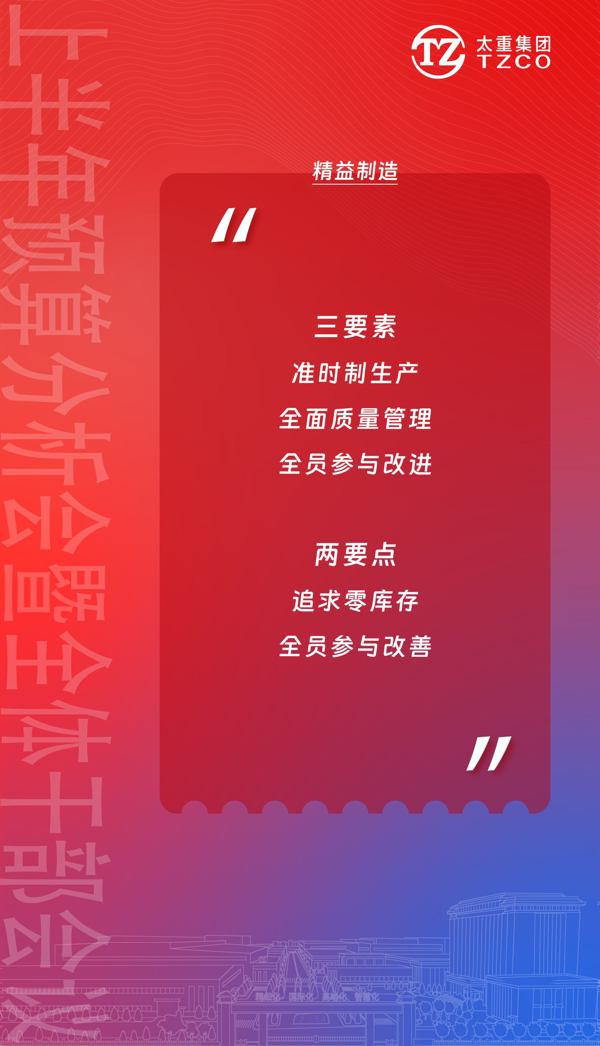 精益制造!制造精品!其理念就是為用戶提供更多的產(chǎn)品價值,以“精益制造”理念貫穿公司高質(zhì)量高速度發(fā)展之路,是所有太重人的必修課。