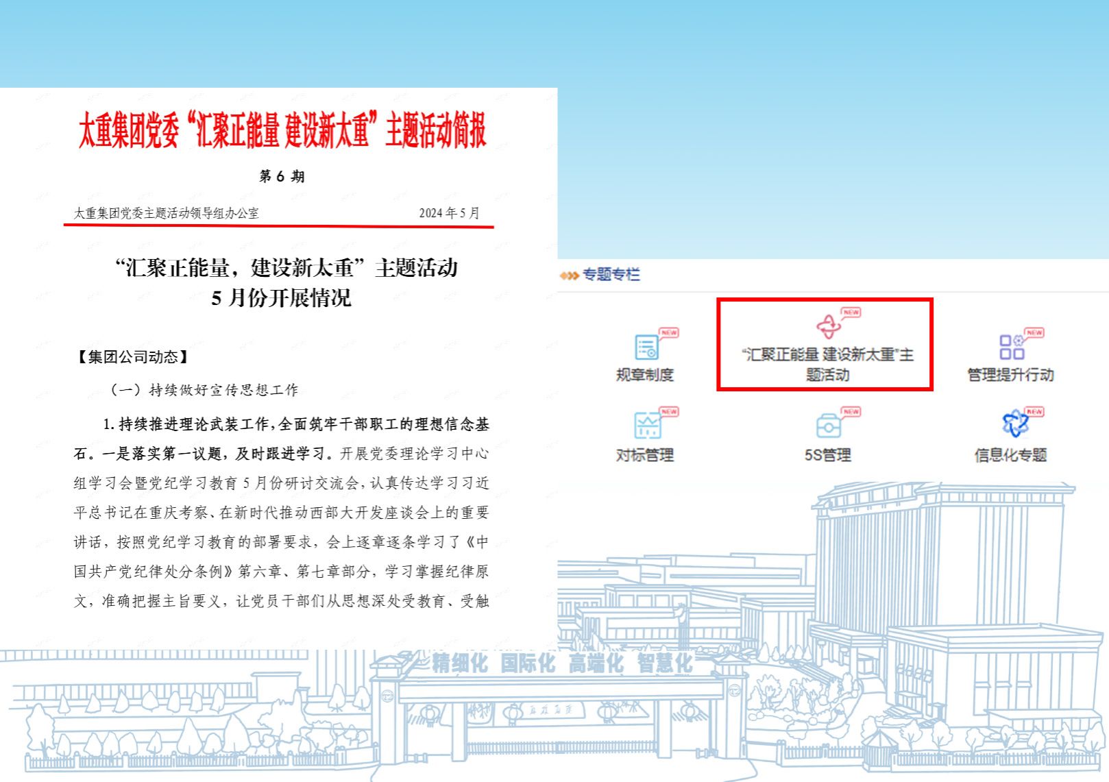 公司匠心宣講隊(duì)深入基層一線、車間班組開展形式多樣的宣講活動(dòng),傳播職工奮斗事跡,讓宣講活動(dòng)既“硬核”又有趣;主流媒體紛紛將鏡頭對(duì)準(zhǔn)太重,多角度展示太重培育和發(fā)展新質(zhì)生產(chǎn)力的蓬勃力量。