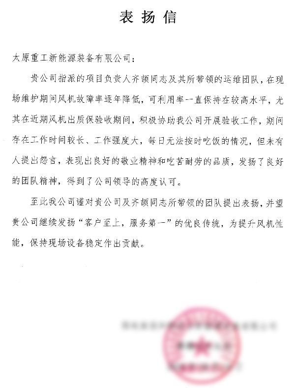 專業(yè)、敬業(yè),吃苦耐勞,用戶至上、服務(wù)第一……一份感謝、一份認(rèn)可。近日,新能源公司運維團(tuán)隊收到風(fēng)電用戶送來的感謝信,真誠為太重服務(wù)點贊!