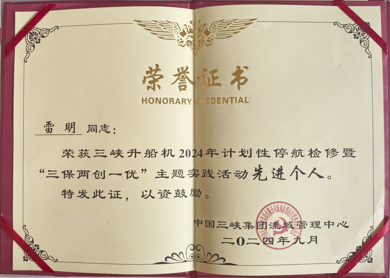 在三峽升船機2024年計劃性停航檢修項目總結(jié)大會上,公司服務(wù)人員雷明被評為“先進個人”稱號。這是他在2023年獲得用戶表彰后,連續(xù)第二年斬獲此項榮譽!爭分奪秒保工期,不遺余力趕進度。本次檢修是三峽升船機通航以來的第四次停航檢修,為期35天,工期緊、任務(wù)重、難度高、風險大,為確保如期完成檢修任務(wù),太重榆液精心組織、周密安排,積極做好人員、檢修工器具、材料及設(shè)備設(shè)施等各項準備工作,針對本次檢修的重難點制定了切實可行的專項施工方案和安全方案。在施工過程中,公司合理組織調(diào)配資源,落實技術(shù)細節(jié)要求,圓滿高效地完成了各項檢修任務(wù),質(zhì)量、安全、進度均達到要求,“太重速度”為我國三峽項目的平穩(wěn)運行再立新功!