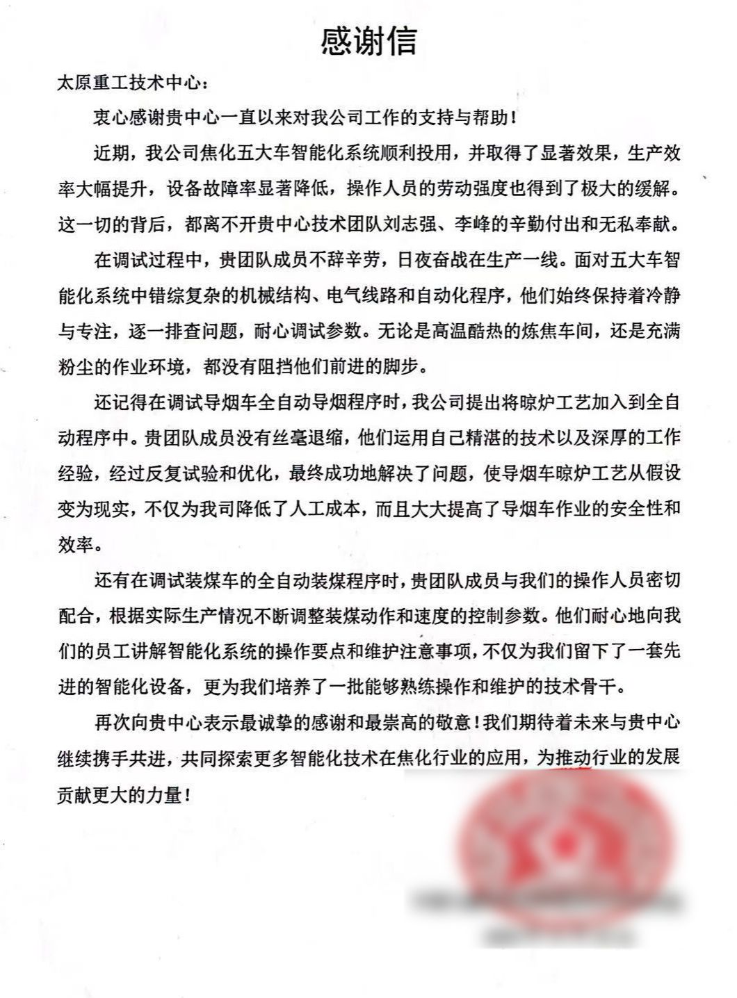 “衷心感謝貴中心一直以來(lái)對(duì)我公司工作的支持與幫助”,近日,公司以卓越的焦?fàn)t智能化成套設(shè)備贏得了用戶的感謝。這封信不僅是對(duì)太重現(xiàn)場(chǎng)調(diào)試團(tuán)隊(duì)辛勤付出的肯定,更是對(duì)焦化設(shè)計(jì)團(tuán)隊(duì)專業(yè)能力和高效協(xié)同精神的贊譽(yù)。