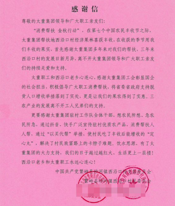 紙箋傳心意,溫情暖寒冬。近日,公司收到一份暖心的“禮物”,一封來(lái)自繁峙縣砂河鎮(zhèn)西沿口村支部委員會(huì)的感謝信。信中對(duì)公司積極開展消費(fèi)幫扶,用心用情用力解決定點(diǎn)幫扶村農(nóng)特產(chǎn)品銷售難題,促進(jìn)農(nóng)民群眾增收表示感謝。