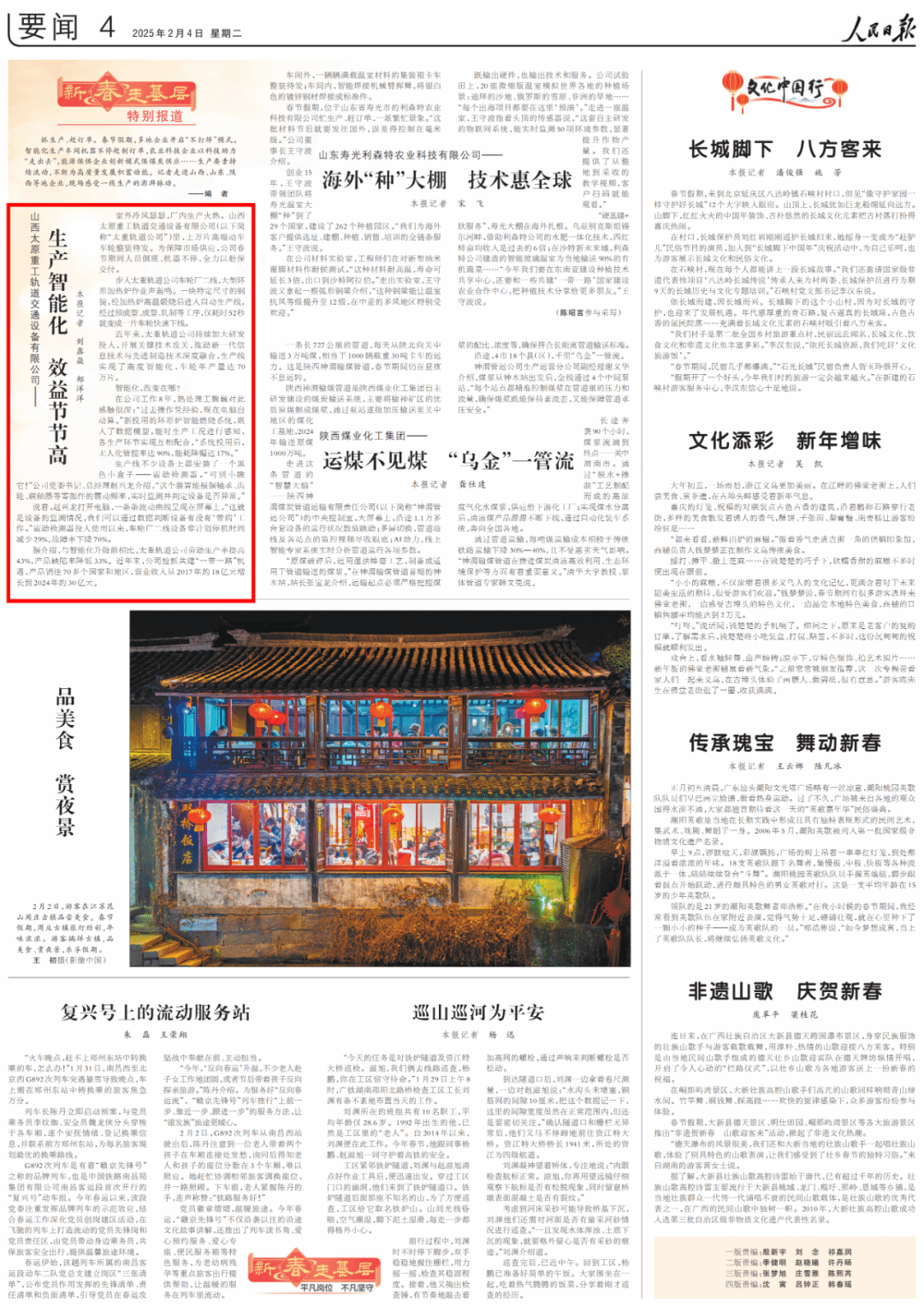 新春伊始,萬(wàn)象更新,太重以亮眼開(kāi)局備受矚目,榮登媒體熱榜。生產(chǎn)智能化、效益節(jié)節(jié)高!2月4日,人民日?qǐng)?bào)《新春走基層·特別報(bào)道》走進(jìn)軌道交通行業(yè)首座“燈塔工廠”——太重軌道公司車輪廠二線,感受智能化生產(chǎn)的澎湃脈動(dòng)。數(shù)據(jù)見(jiàn)證非凡成就:勞動(dòng)生產(chǎn)率提高43%,產(chǎn)品缺陷率降低33%,營(yíng)業(yè)收入從2017年的18億元增長(zhǎng)到2024年的30億元,清晰勾勒出太重向智能化大步邁進(jìn)、效益持續(xù)上揚(yáng)的堅(jiān)實(shí)步伐。2月5日,山西新聞聯(lián)播《節(jié)后上班首日 我省各地奮進(jìn)“春天里”》欄目也將鏡頭對(duì)準(zhǔn)太重工程起重機(jī)項(xiàng)目建設(shè)現(xiàn)場(chǎng),工人們忙碌而有序,大型機(jī)械轟鳴作響,努力打造高端裝備制造雙鏈雙千億產(chǎn)業(yè)集群,彰顯太重人奮進(jìn)爭(zhēng)先的蓬勃朝氣與豪邁干勁!春?jiǎn)⑿鲁?,開(kāi)局沖刺!2025,讓我們以?shī)^斗之名,攜手共進(jìn),續(xù)寫太重新的輝煌!