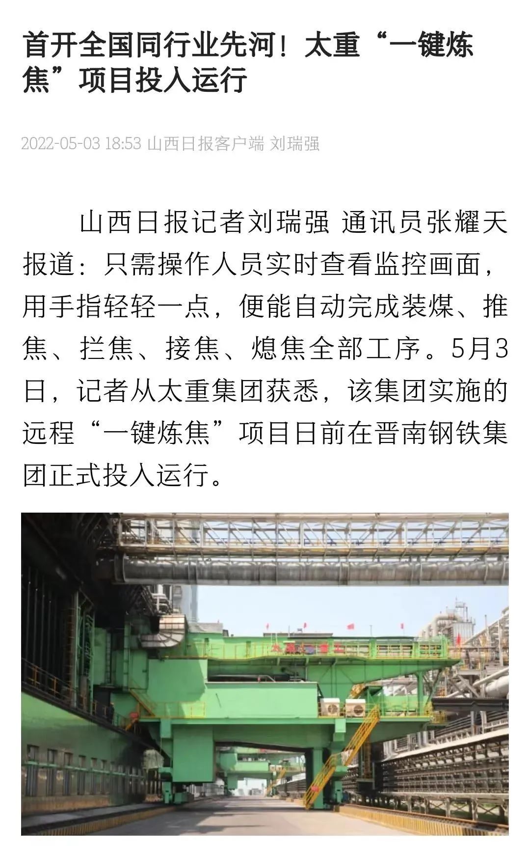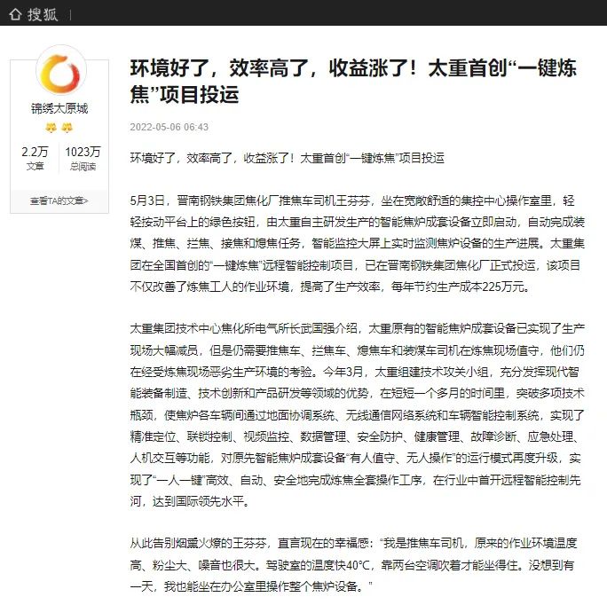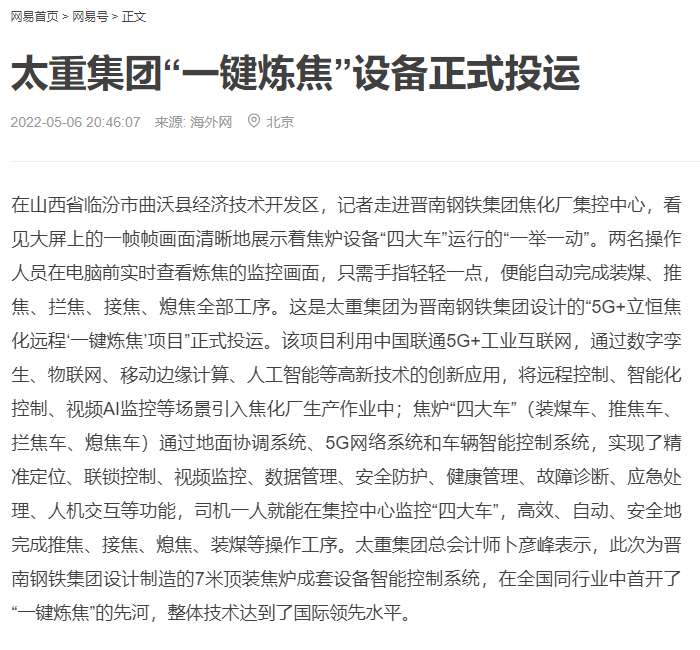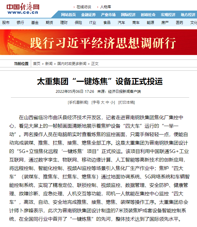 央廣網(wǎng)、中國鋼鐵新聞網(wǎng)、騰訊以《全國首創(chuàng)!太重集團“一鍵煉焦”設(shè)備正式投運》為題,聚焦太重集團以科技創(chuàng)新激發(fā)“智造”新活力為出發(fā)點,全面展示“智能+5G”在“一鍵煉焦”上的應(yīng)用,助力焦化領(lǐng)域效能提升、節(jié)能降耗和轉(zhuǎn)型升級。中國經(jīng)濟網(wǎng)、網(wǎng)易、山西國資以《太重集團“一鍵煉焦”設(shè)備正式投運》為題,報道太重集團“一鍵煉焦”項目正式開啟智能煉焦新時代,填補技術(shù)空白,開創(chuàng)國內(nèi)焦化行業(yè)先河。搜狐網(wǎng)以《環(huán)境好了,效率高了,收益漲了!太重首創(chuàng)“一鍵煉焦”項目投運》為題,重點展示了太重集團“一鍵煉焦”項目成果,實現(xiàn)智能綠色工廠轉(zhuǎn)型再升級。山西日報、山西晚報、太原日報分別以《首開全國同行業(yè)先河!太重“一鍵煉焦”項目投入運行》《太重大發(fā)明:動動手指“一鍵煉焦”》《太重首創(chuàng)“一鍵煉焦”項目投運》為題,聚焦太重“智造”再提速,充分展現(xiàn)公司以“三性五化”為新產(chǎn)品開發(fā)目標,助力國家實現(xiàn)“雙碳”目標。