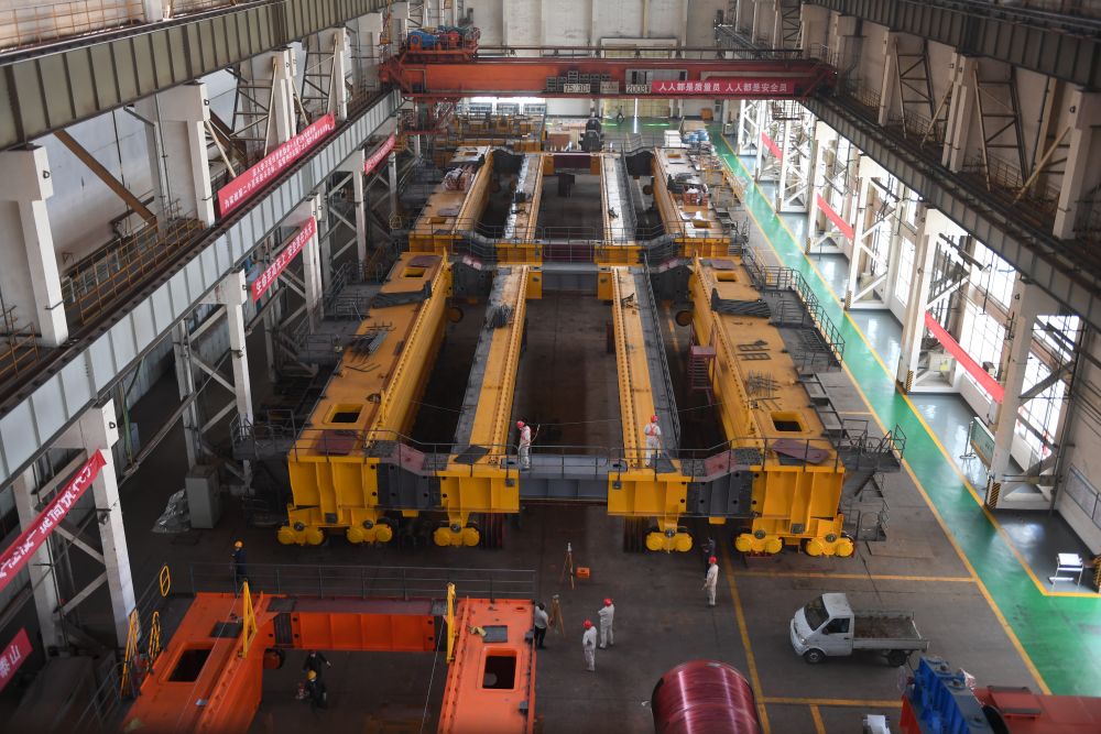 在太重集團(tuán)起重機(jī)分公司車間,550噸鑄造起重機(jī)正在進(jìn)行裝配作業(yè)。