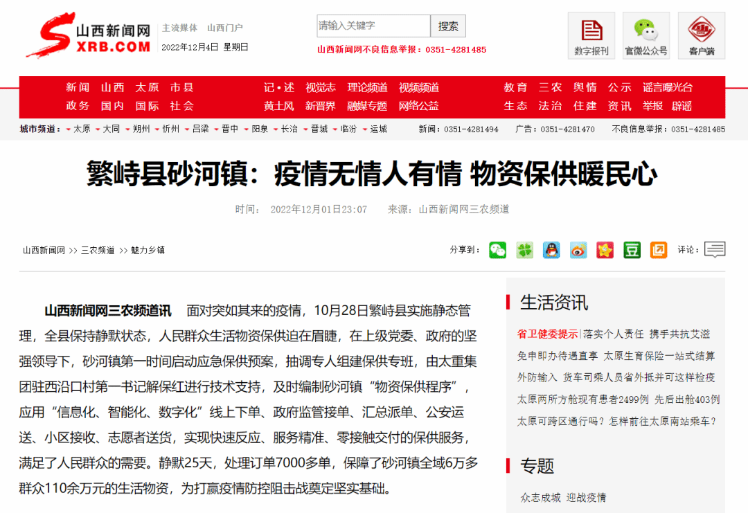 近日,山西新聞網(wǎng)刊發(fā)《繁峙縣砂河鎮(zhèn):疫情無情人有情 物資保供暖民心》文章,報(bào)道太重集團(tuán)駐村工作隊(duì)面對(duì)疫情嚴(yán)峻形勢(shì),迅速響應(yīng)、積極應(yīng)戰(zhàn),協(xié)助砂河鎮(zhèn)高效快捷完成物資保供任務(wù),用行動(dòng)扛起疫情防控責(zé)任,為打贏疫情防控攻堅(jiān)戰(zhàn)貢獻(xiàn)國(guó)企力量。