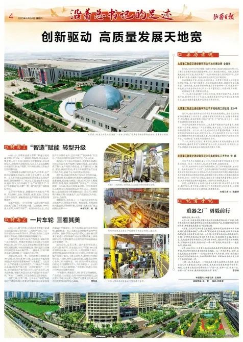 6月24日,山西日報頭版及四版整版多篇報道紛紛聚焦太重集團(tuán),深入報道了在習(xí)近平總書記考察調(diào)研太重六年間的巨大變化。太重集團(tuán)在高質(zhì)量發(fā)展的道路上蹄疾步穩(wěn),用實(shí)際行動回應(yīng)著領(lǐng)袖的殷殷囑托。作為省內(nèi)唯一“雙鏈主”企業(yè),太重不斷加大科研投入力度,在突破關(guān)鍵核心技術(shù)、促進(jìn)產(chǎn)業(yè)轉(zhuǎn)型升級的最前沿業(yè)績突出,蔚然形成千帆奮競、全面創(chuàng)新的生動局面,受到了主流媒體的關(guān)注。