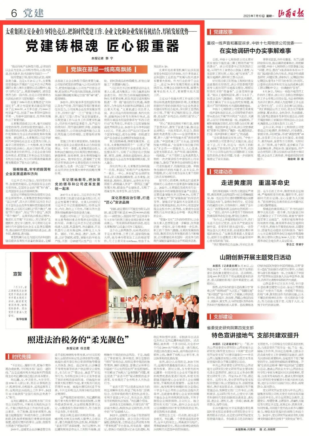 今天,山西日?qǐng)?bào)刊發(fā)《黨建鑄根魂 匠心鍛重器》文章,聚焦太重集團(tuán)以習(xí)近平新時(shí)代中國(guó)特色社會(huì)主義思想為指引,認(rèn)真學(xué)習(xí)貫徹黨的二十大精神,充分發(fā)揮黨組織政治核心、政治引領(lǐng)作用,扛起建設(shè)先進(jìn)文化的責(zé)任,立足企業(yè)自身特色和亮點(diǎn),把新時(shí)代黨建工作和企業(yè)文化建設(shè)有機(jī)結(jié)合起來(lái),實(shí)現(xiàn)高質(zhì)量高速度發(fā)展,向著建設(shè)具有國(guó)際一流競(jìng)爭(zhēng)力的現(xiàn)代智能裝備制造企業(yè)目標(biāo)闊步邁進(jìn)。