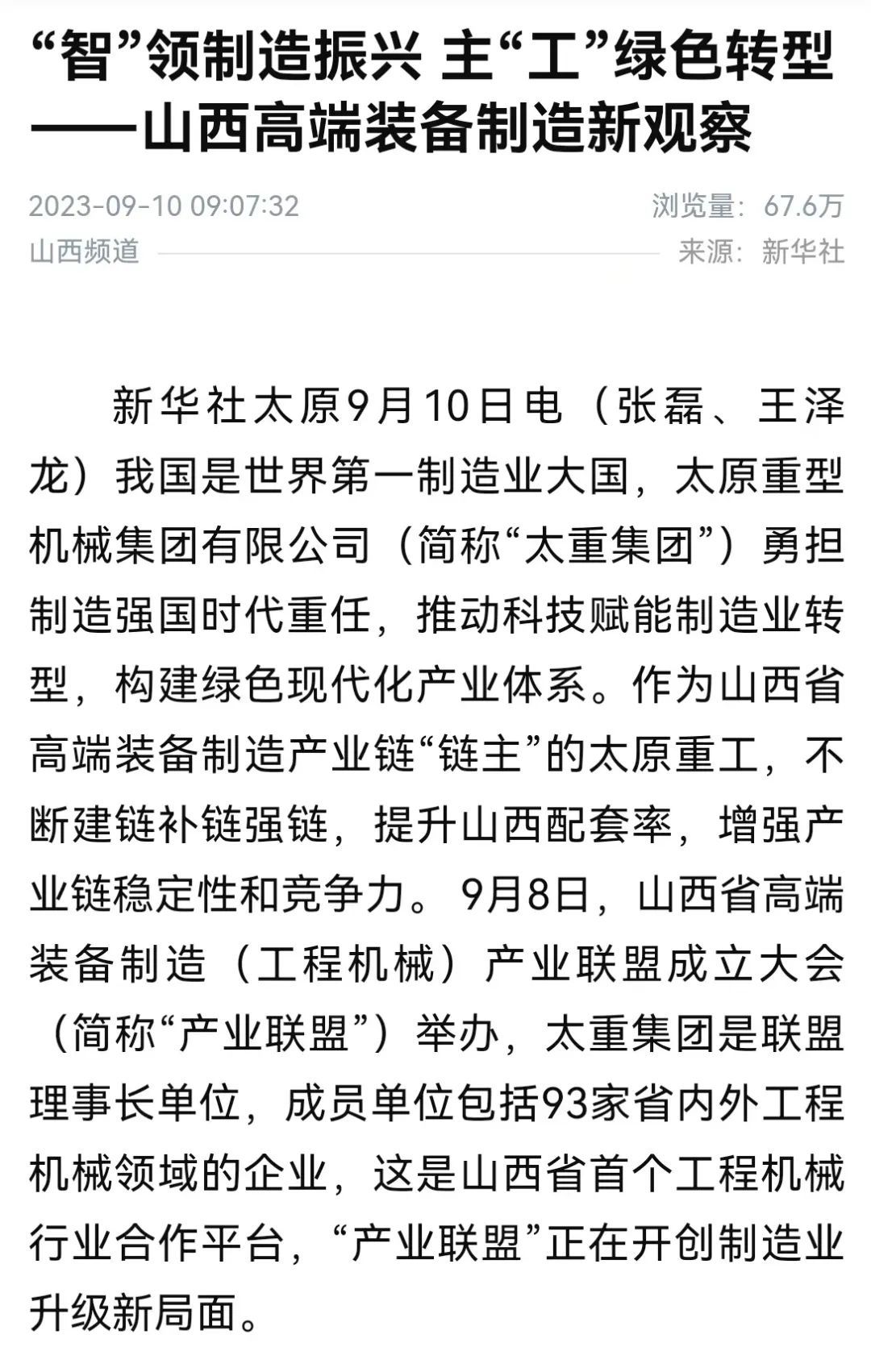 我國(guó)是世界第一制造業(yè)大國(guó),太原重型機(jī)械集團(tuán)有限公司(簡(jiǎn)稱(chēng)“太重集團(tuán)”)勇?lián)圃鞆?qiáng)國(guó)時(shí)代重任,推動(dòng)科技賦能制造業(yè)轉(zhuǎn)型,構(gòu)建綠色現(xiàn)代化產(chǎn)業(yè)體系。作為山西省高端裝備制造產(chǎn)業(yè)鏈“鏈主”的太重集團(tuán),不斷建鏈補(bǔ)鏈強(qiáng)鏈,提升山西配套率,增強(qiáng)產(chǎn)業(yè)鏈穩(wěn)定性和競(jìng)爭(zhēng)力。9月8日,山西省高端裝備制造(工程機(jī)械)產(chǎn)業(yè)聯(lián)盟成立大會(huì)(簡(jiǎn)稱(chēng)“產(chǎn)業(yè)聯(lián)盟”)舉辦,太重集團(tuán)是聯(lián)盟理事長(zhǎng)單位,成員單位包括93家省內(nèi)外工程機(jī)械領(lǐng)域的企業(yè),這是山西省首個(gè)工程機(jī)械行業(yè)合作平臺(tái),“產(chǎn)業(yè)聯(lián)盟”正在開(kāi)創(chuàng)制造業(yè)升級(jí)新局面。