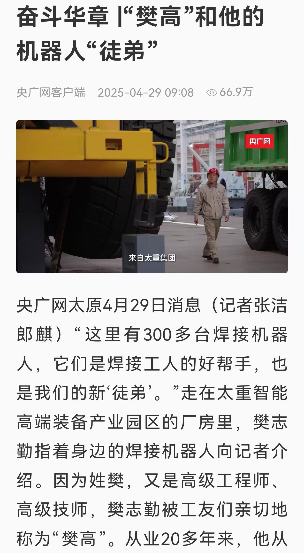“五一”國際勞動節(jié)之際,央廣網(wǎng)發(fā)布專題視頻《奮斗華章|“樊高”和他的機器人“徒弟”》,聚焦太重集團全國勞模、大國工匠樊志勤,講