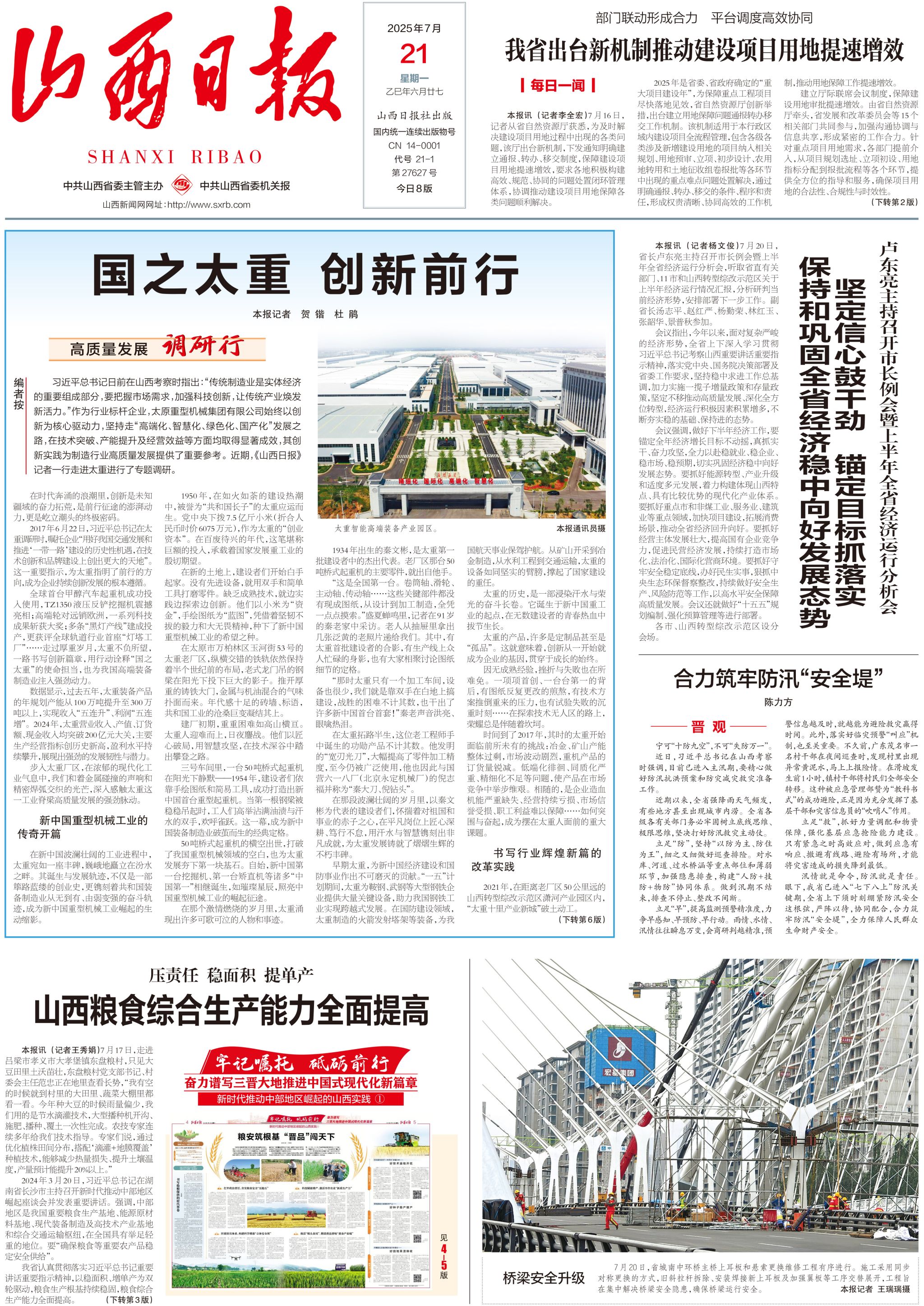 今日,山西日報(bào)【高質(zhì)量發(fā)展調(diào)研行】專欄刊發(fā)重磅文章《國之太重 創(chuàng)新前行》,頭版頭條深度聚焦“共和國長子”奮進(jìn)足跡,觸摸七十載不變的強(qiáng)國初心,展示新時(shí)代太重奔涌不息的創(chuàng)新脈動!